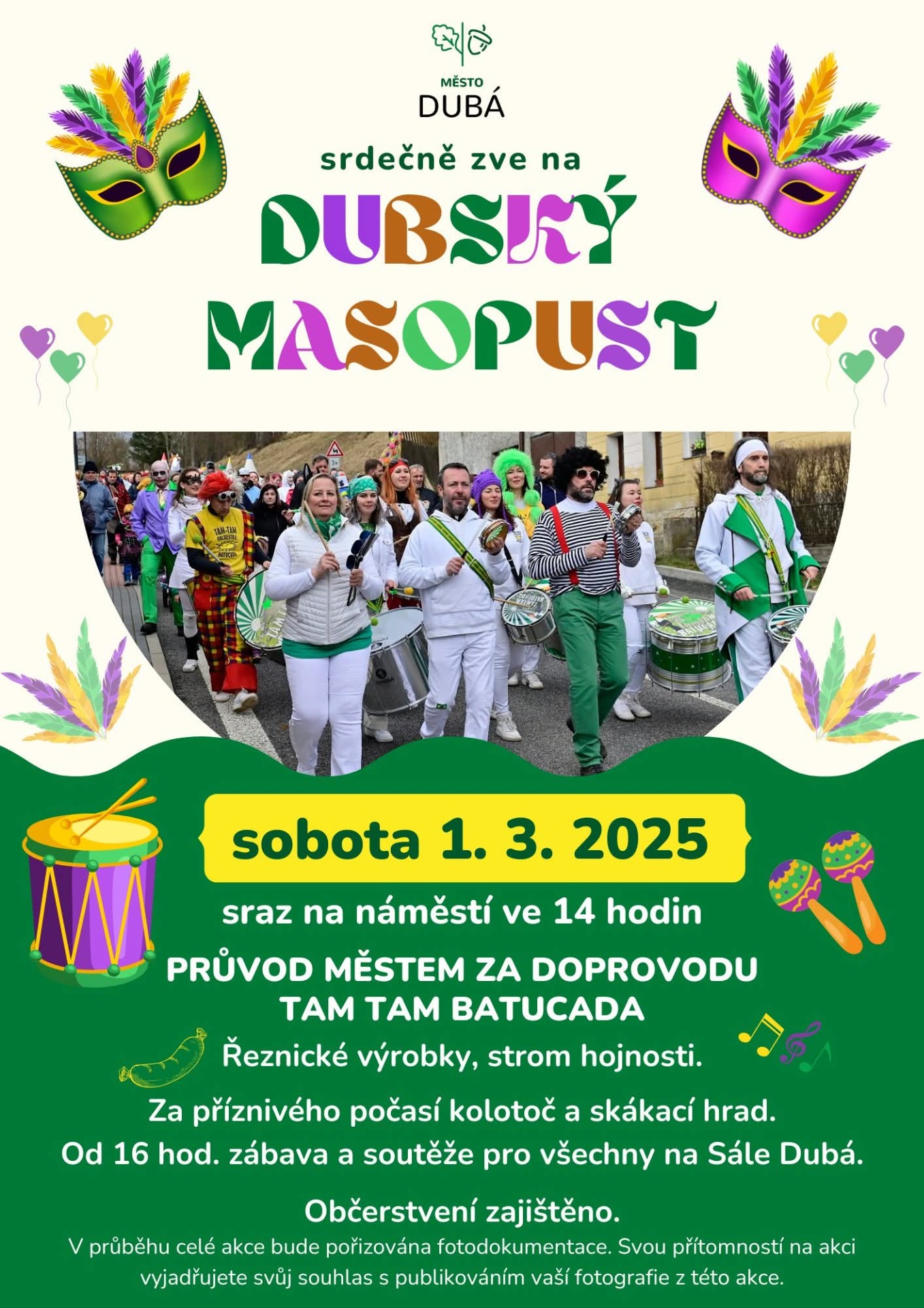 Masopustní průvod dorazil až k budově Sálu,kde na všechny účastníky čekali soutěže, občerstvení a uvnitř pak diskotéka pro děti .